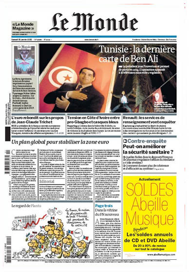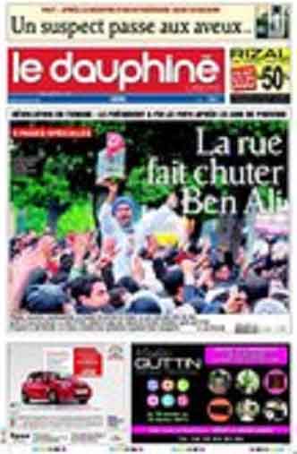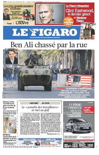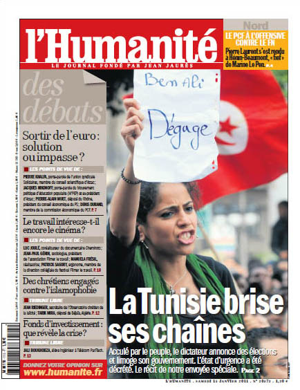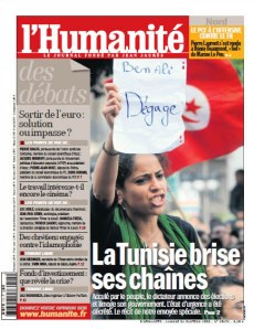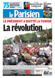 Quelques images des pages de couverture de la presse quotidienne en France au lendemain du 14 janvier 2011. Je n’ai pris que celles qui avaient relaté l’évènement . Si par mégarde j’en ai oublié quelques unes ,je ne manquerai pas de les ajouter si vous mes les envoyez .