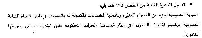 وتأسيسا لنظام جمهوري ديمقراطي تشاركي، في إطاردولة مدنيةً الحكم فيها للقانون و السيادة فيها للشعب عبر التداول السلمي على الحكم بواسطة الإنتخابات الحرة وعلى مبدإ الفصل بين السلطات والتوازن بينها، ويكون فيه حقُّ التنظّمِ القائمِ على التعددية وحيادُ الإدارة والحكمُ الرشيد هي أساسَ التنافس السياسي، وتضمن فيه الدولة احترام الحريات وحقوق الإنسان واستقلالية القضاء والمساواة في الحقوق والواجبات بين جميع المواطنين والمواطنات والعدل بين الجهات،