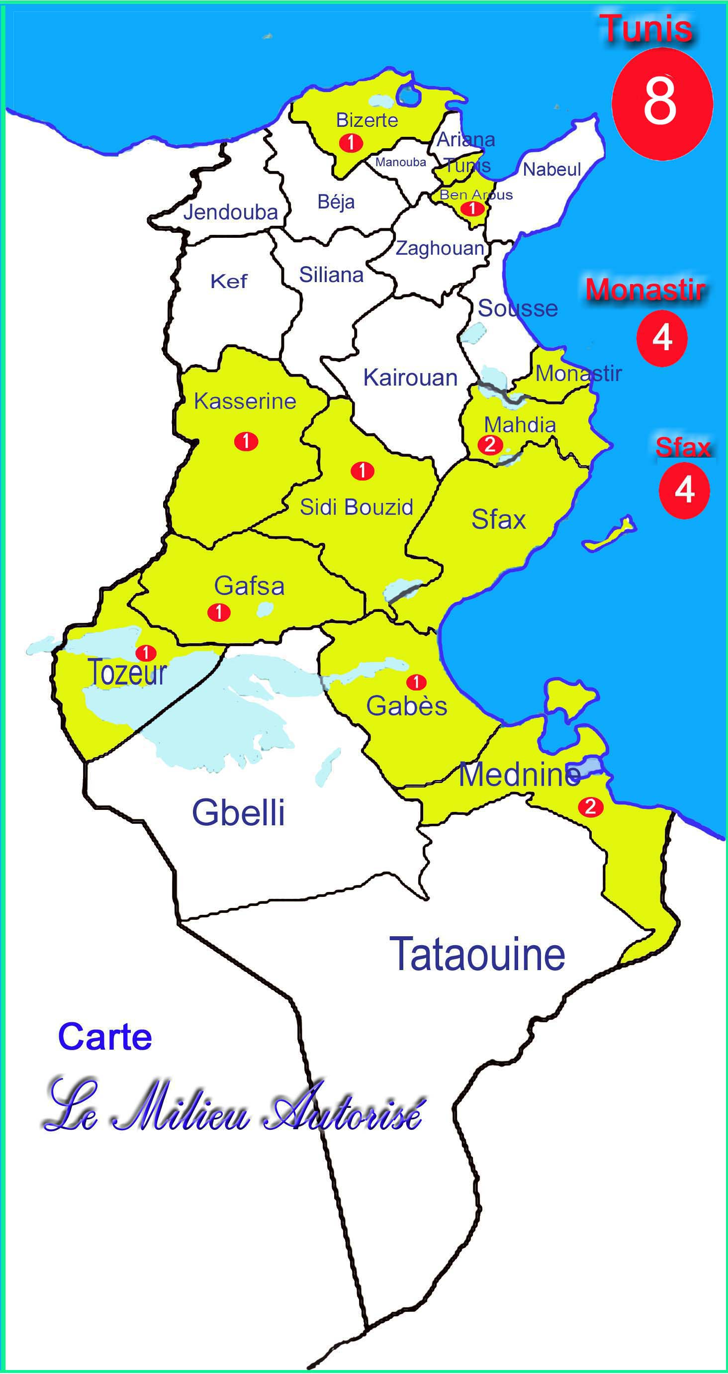 Voici la carte de la Tunisie qui indique le lieu géographique, du gouvernorat de provenance des nouveaux ministres et secrétaires d’État dans le gouvernement de M.Mehdi Jomâa.