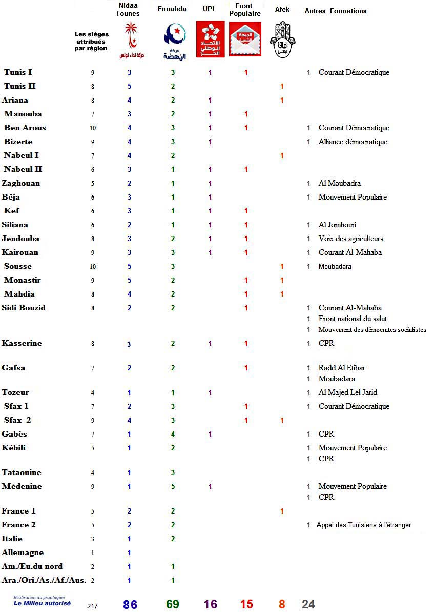 À ce jour et à cette heure-ci, d’après les résultats fournis par l’Isie, la configuration de l’Assemblée des députés du peuple, doit se présenter suivant le tableau suivant (rectifié après l’invalidation de l’élection d’un candidat à Kasserine (Ettakattol) au profit d’un élu supplémentaire de la liste de Nidaa) :
