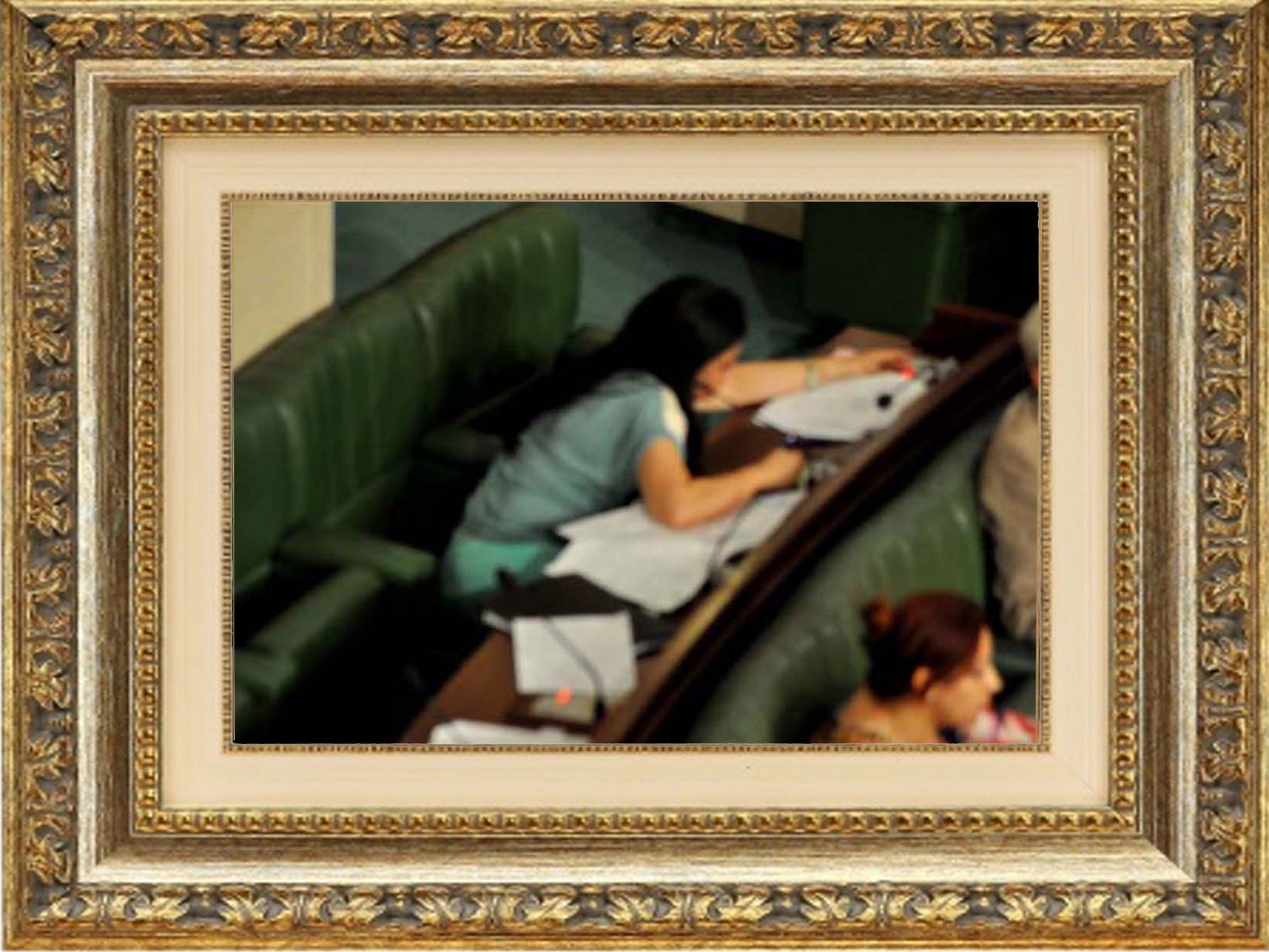De la triche ? Sans doute ! Mais, c’est la photo prise sur le vif, qui fige le geste où on voit la corps d’une femme dont la moitié supérieure embrasse et s’affale goulument sur la boiserie du pupitre et dans une extension de la main gauche vers le pupitre du voisin, condense toute la splendeur de la photo.