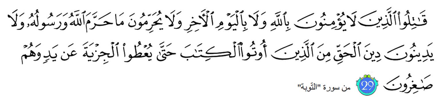 [Combattez ceux qui ne croient pas en Dieu et ne croient pas au Jour dernier, qui n’interdisent pas ce que Dieu et son Messager ont interdit, qui ne transmettent la religion de la vérité, de ceux qui ont reçu le Livre que s’ils perçoivent l’imposition par leurs mains en petitesse.] (Aya 29)