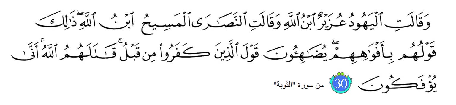 « Les Juifs ont dit Aziz fils de Dieu et les Chrétiens ont dit le Christ fils de Dieu. Tel est leur dire par leur bouches. Ils imitent le dire de ceux qui avaient blasphémé avant. Dieu les a combattus jusqu’à ce qu’ils méritent. » (Aya 30)