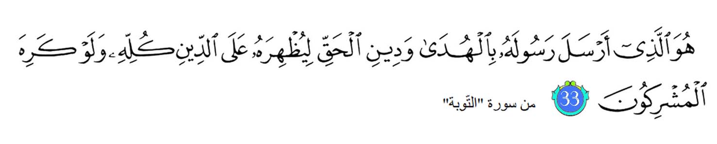 « C’est lui qui a envoyé son Messager, avec de la sagesse et la religion de la vérité pour qu’elle soit visible, sur toute la religion, afin qu’elle triomphe sur toute autre religion, même si les blasphémateurs en soient dégoûtés. « (Aya 33)