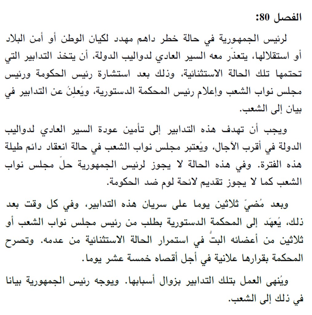 [ Il revient au président de la république, en cas de danger imminent qui menace les fondements de la nation, la sécurité ou l’indépendance du pays, qui entrave le fonctionnement ordinaire des rouages de l’État, de prendre les mesures qu’exige cette situation exceptionnelle. Ceci, après consultation du président du gouvernement, du président de l’Assemblée des représentants du peuple et après avoir tenu informé le président de la Cour constitutionnelle, il fait une déclaration sur les mesures dans un avis à la population.